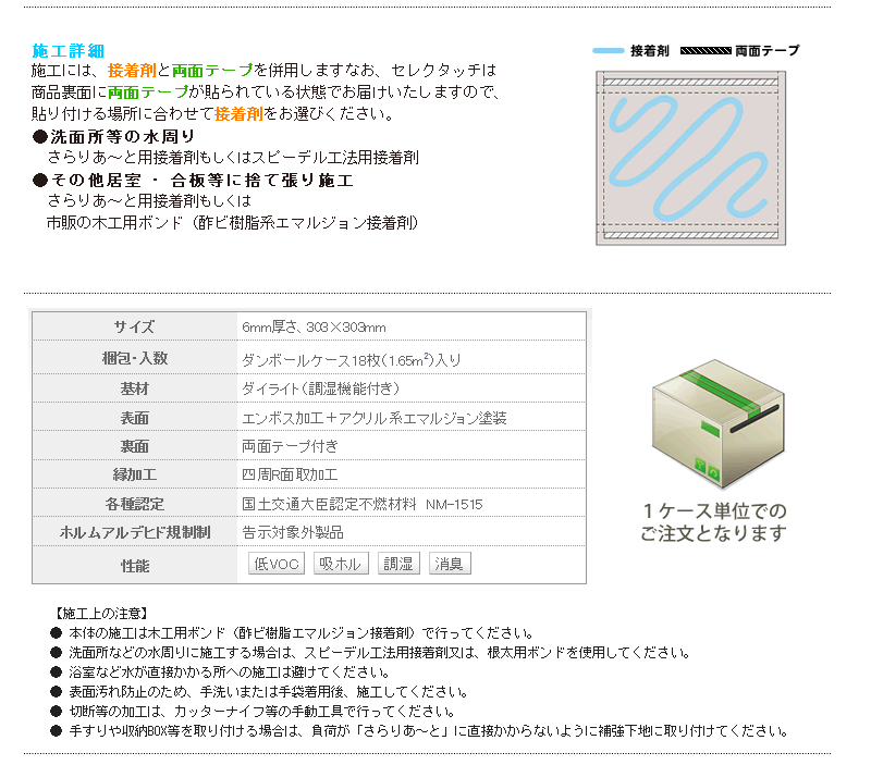 詳しくはコチラ 商品の施工方法はこちら 商品の道具一覧はこちら こちらの商品は1枚あたりのサイズが幅303×長さ303(mm)、1ケースあたり18枚入りになります。