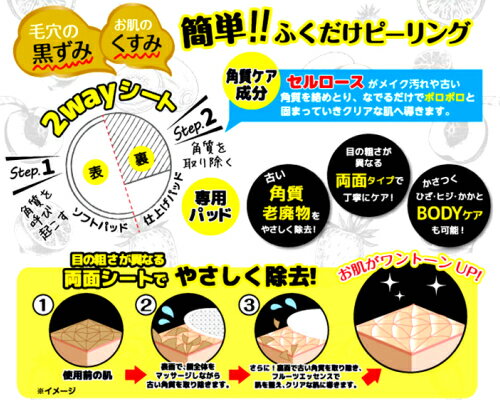 ■発売元:サンスマイル ■広告文責:池上商事 関連商品 エッセンスマスク 大豆イソフラボン エッセンスマスク ビタミン エッセンスマスク ローヤルゼリー エッセンスマスク ハチ毒 エッセンスマスク 真珠 エッセンスマスク サクラ エッセンスマスク ヨーグルトシリーズアップルマンゴー エッセンスマスク カタツムリ 30枚入「2SETEP! 簡単ふくだけピーリング」角質ふきとりシート・古い角質、老廃物をやさしく除去・目の粗さが異なる両面タイプで丁寧にケア・かさつくひざ、ひじ、かかとボディケアも可能全5種類・ストロベリー(フラガリアチロエンシス果実エキス)・レモン(レモン果実エキス)・キウイ(キウイエキス)・ピーチ(モモ果実葉エキス)・オレンジ(オレンジ果実エキス)<シート特徴>表:コットン100%ソフトパッド・・・角質を呼び起こす裏:極細仕上げパッド・・・角質を取り除く<使用方法>1、洗顔後、水気を拭き取ります。