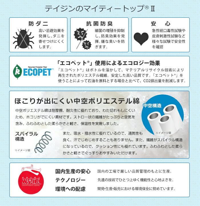 ・中綿には防ダニ・抗菌・防臭効果のあるテイジンのマイティトップ2ECOを使用。