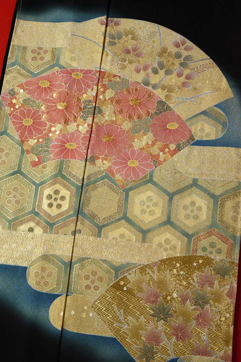 ◆ おすすめポイント ◆ 京友禅の第一人者「松井青々」氏作 ヱ霞と亀甲を背景にした扇面の中に金彩や刺繍、金駒刺繍が施された菊や楓、萩が描かれております。
